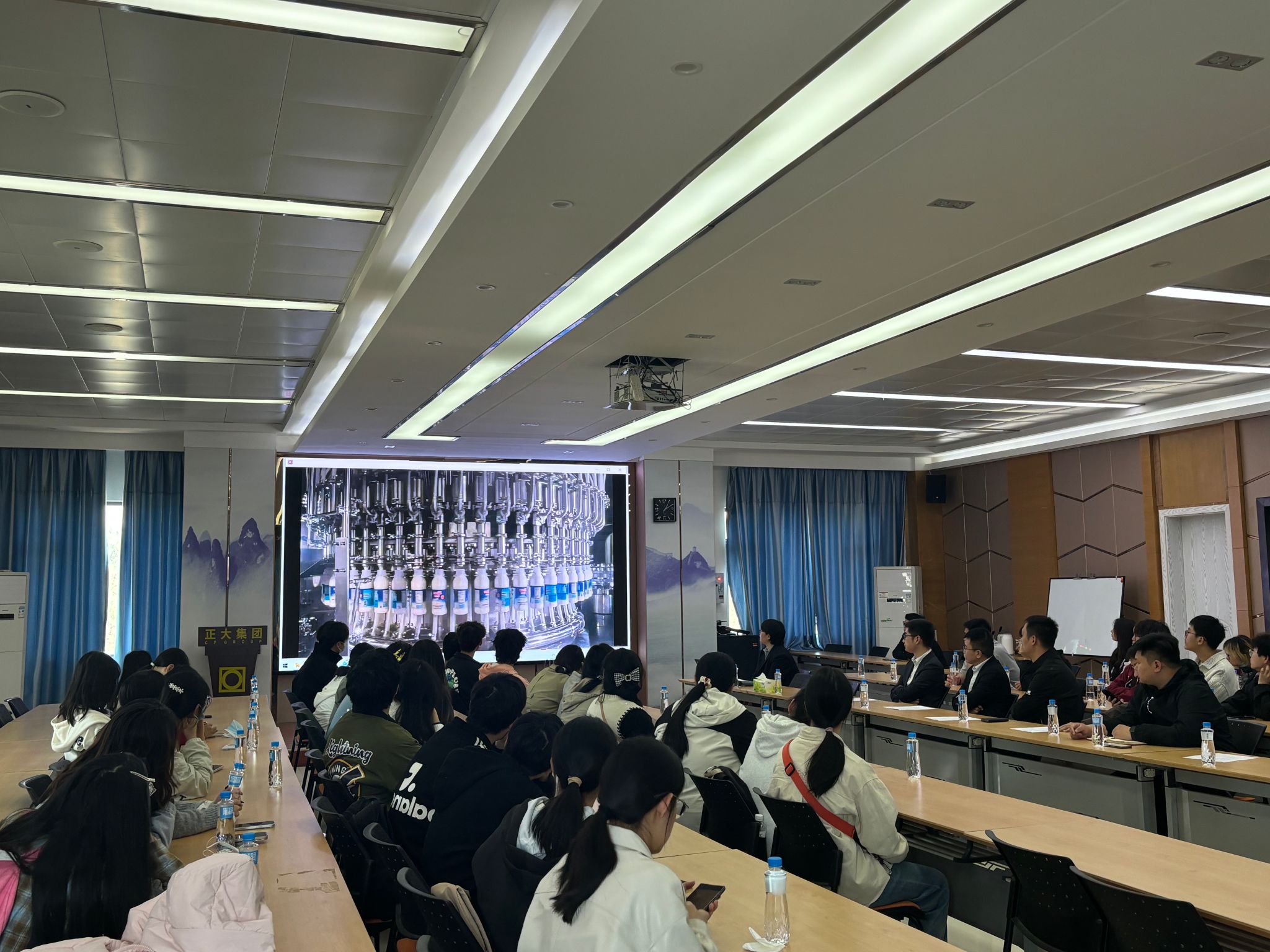王玉梅向师生介绍正大集团秉承着“致力于创造物质食粮和精神食粮以及共享的价值观,让所有人健康和幸福”的发展愿景,坚持“利国、利民、利企业”的经营理念,在行业内不断深耕发展。程林青和陈礼海分别就公司生产工艺和饲料品质管理展开详细讲解,深入了解饲料从原料到成品的科学生产流程以及严格的品质管控体系。