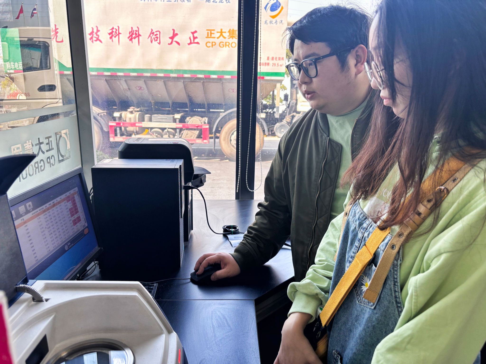 随后师生参观了饲料生产部车间和品管部工作室,领会“安全保障”和“生物防控”的重要性。陈礼海介绍了生产车间的生产布局,通过参观通道走访了主车间和中控室,他表示:“机械化、自动化、安全化、可视化、标准化、智能化的生产工艺和生产设备缓解了人工劳动强度,提高服务效率,并降低成本。”在品管部工作室,程林青向师生介绍了各种工作仪器和设备,并展示了其正确使用方法。并向同学们展示了淀粉、酒糟、豆粕、黄豆、巧克力粉、小麦等各类样品,强调饲料科学配比的重要性,同时解读了饲料的科技含量,他表示:“配方至关重要,其质量与贡献效果息息相关。”