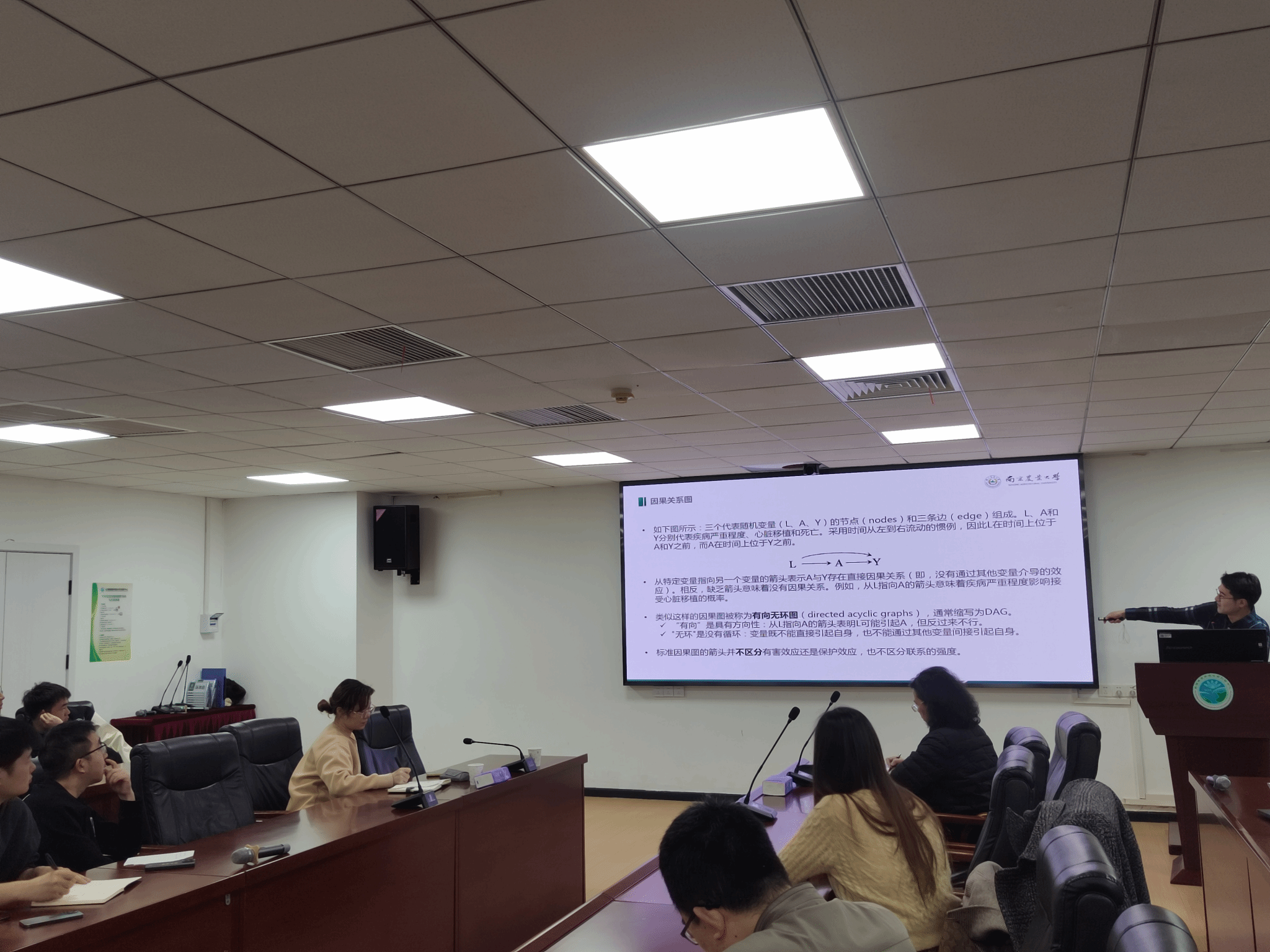 在聚焦当前热点方向“因果推论”环节中,杨丹晨博士分享了最新的研究进展,并通过多个实例剖析如何识别和规避流行病学研究中的常见误区。例如,在分析心脏移植与死亡率之间关系的案例中,他利用因果关系的有向无环图(DAG)清晰展示了疾病严重程度、心脏移植与死亡三者之间的复杂因果路径。他还深入探讨了研究中偏倚的产生机制,并通过生动的案例分析,强调不同统计方法对研究结论可能产生的重要影响,帮助与会师生更加全面地理解流行病学研究的潜在陷阱。