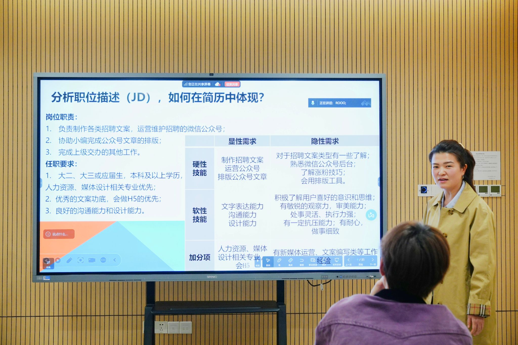 关于简历写作流程,曹雯介绍道,其分为前期准备与制作两个阶段。首先绘制专业职业就业地图,借助人工智能大数据深入了解行业信息;接着梳理能体现个人综合素质与能力的经历,完成个人与职业的匹配,明确岗位胜任力;重点是分析岗位描述与职位说明书(JD),洞察显隐性需求及硬软性技能。此外,她详细讲解了简历包含的个人信息、教育背景、实习经历等内容,着重阐释了内容表达应遵循的“STAR原则”,即通过具体化、数据化和技能化的方式呈现行动成果,使其更加具象化。