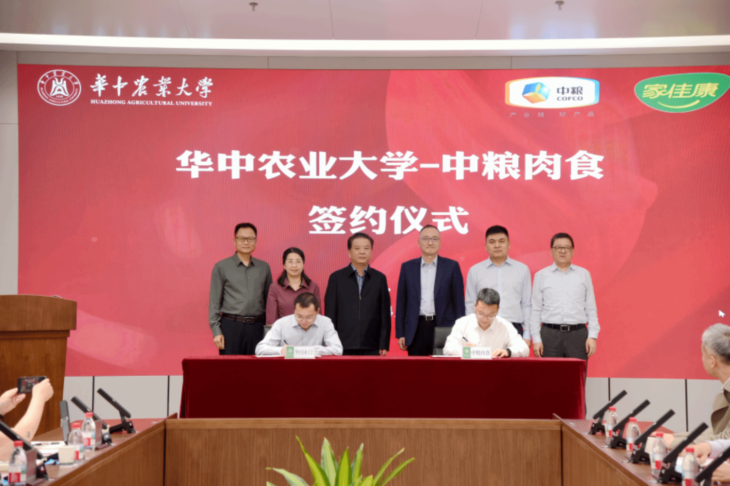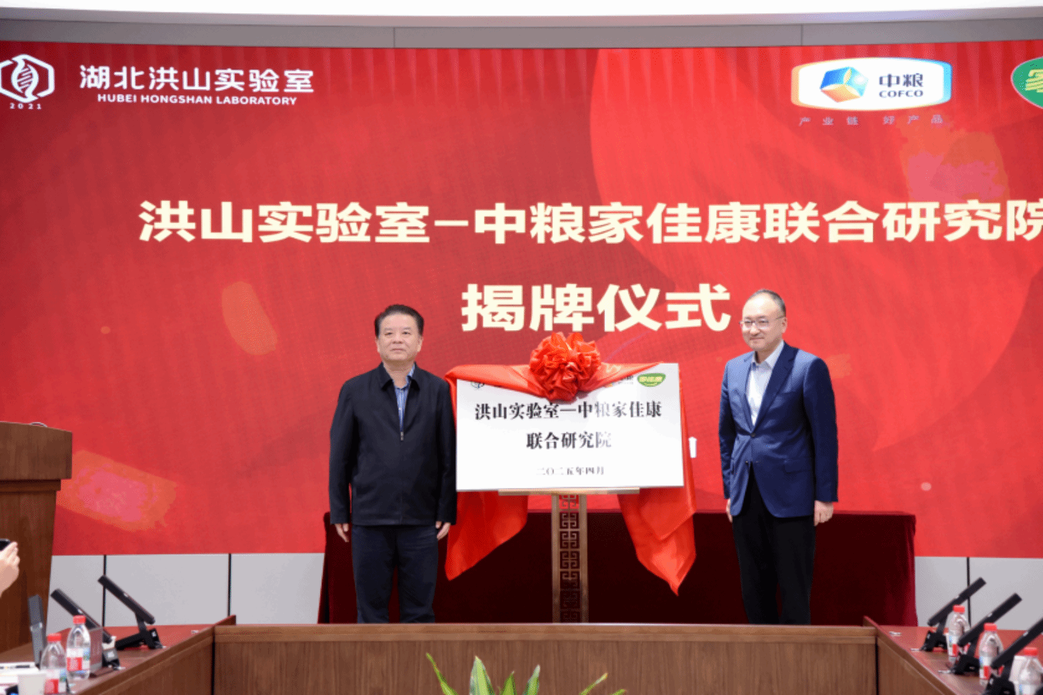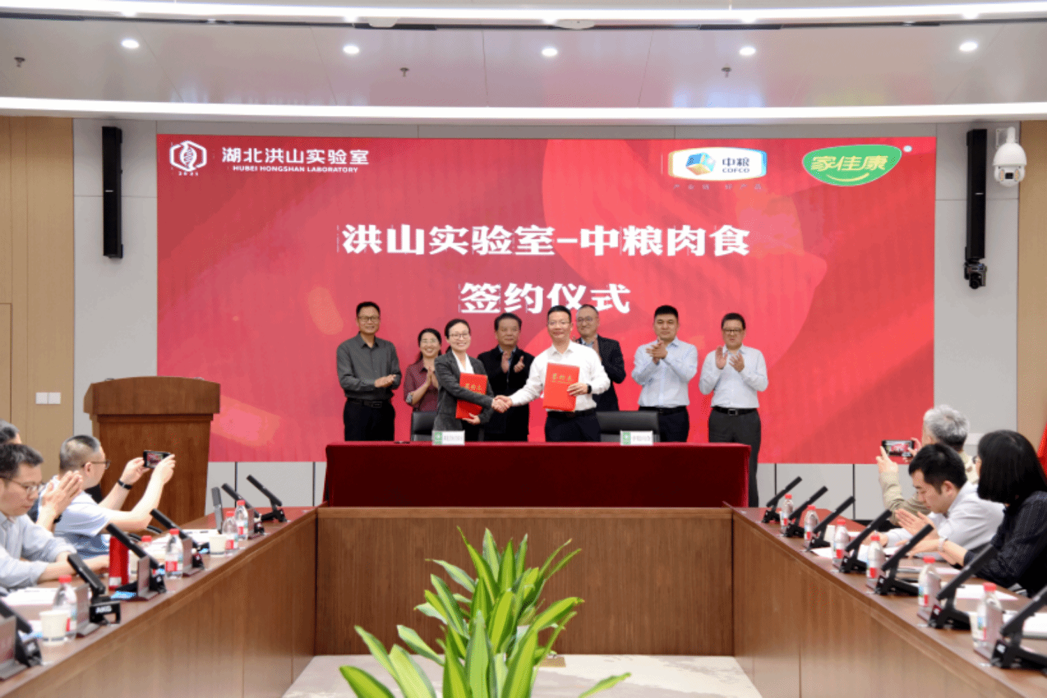 (南湖新闻网讯)4月16日,华中农业大学、湖北洪山实验室与中粮肉食合作协议签约暨“洪山实验室—中粮家佳康联合研究院”揭牌仪式在洪山实验室A111会议室举行。中粮肉食投资有限公司党委书记、董事长高翔,校党委副书记、副校长、湖北洪山实验室法定代表人姚江林出席签约仪式并致辞。