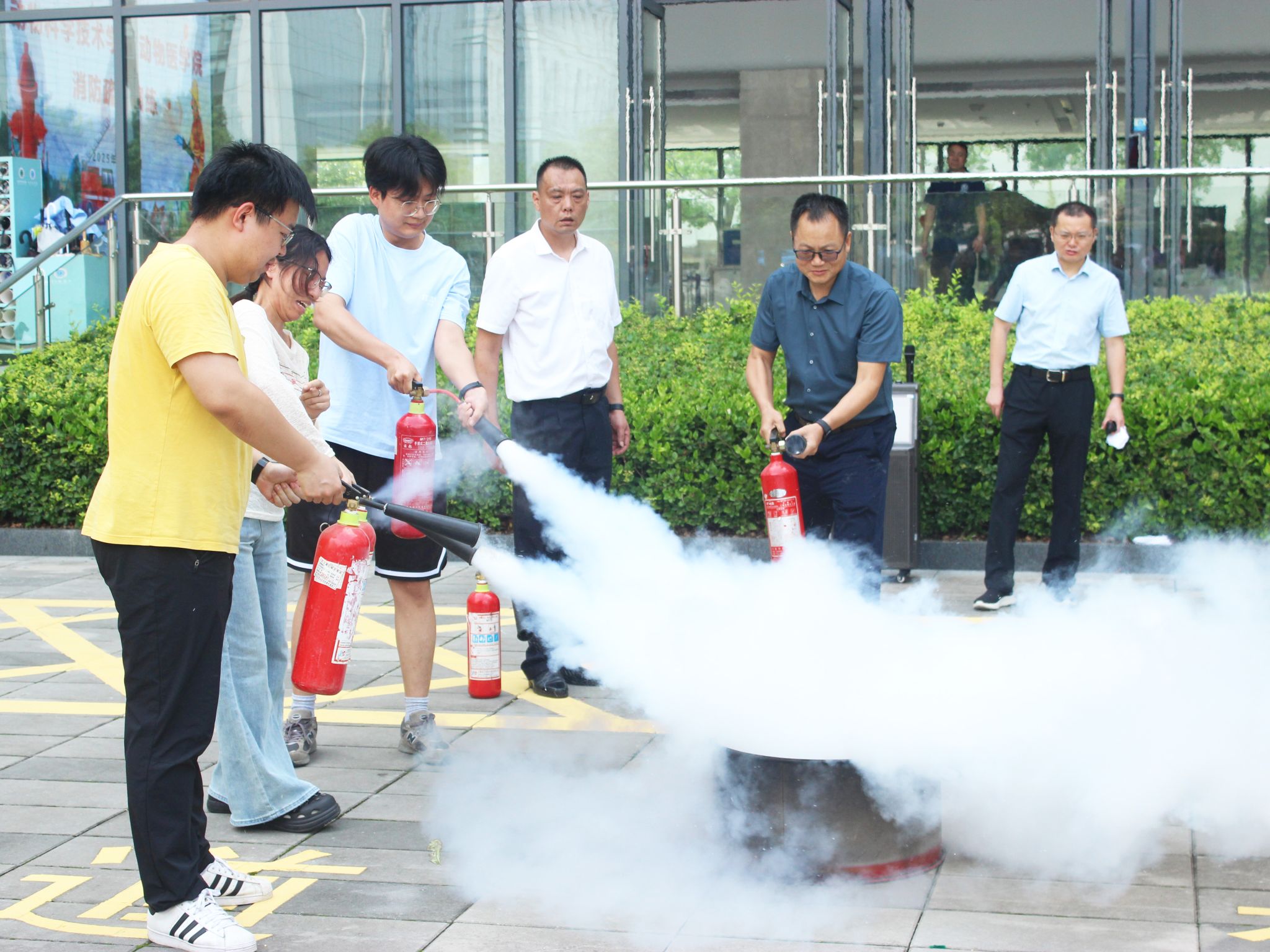 疏散演练完成后,学院在四综D座广场开展了灭火器使用实操培训。校园建设与安全保卫部孙勇老师现场详细讲解了灭火器的"提、拔、握、压"四字使用口诀,重点介绍了不同种类火灾的扑救方法和注意事项。现场师生在专业指导下轮流操作灭火器,扑灭模拟火源,重温初起火灾处置的基础技能。