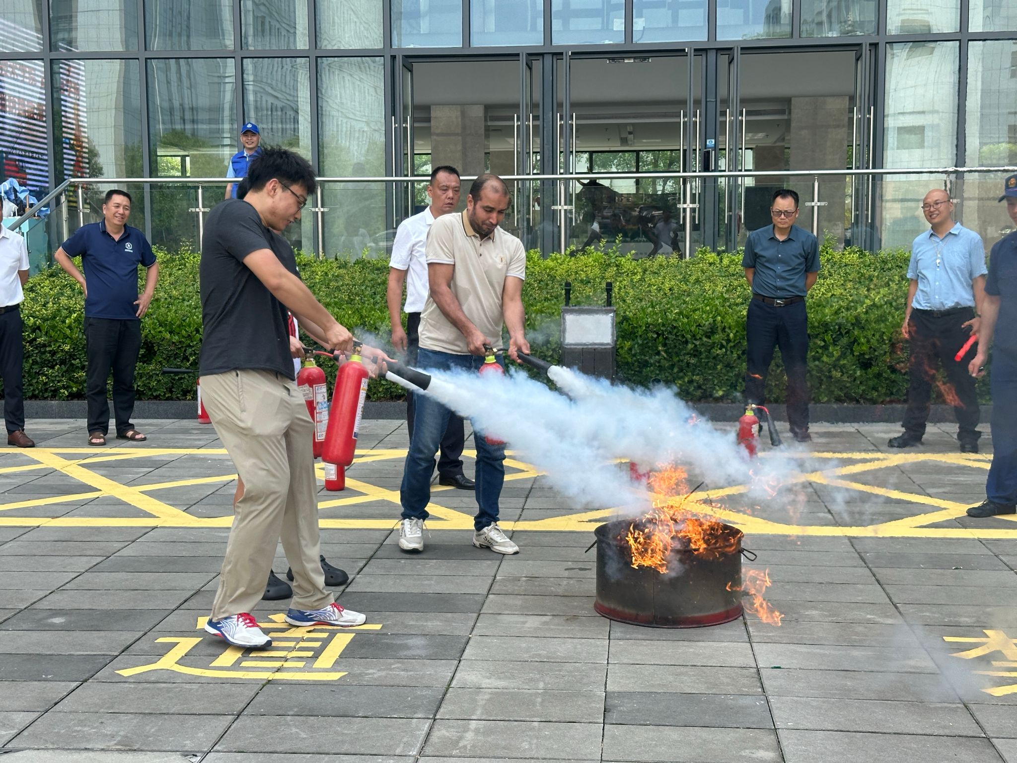 刘兴斌书记与师生一同实操灭火(记者 任清竹 梁舒雯 摄)