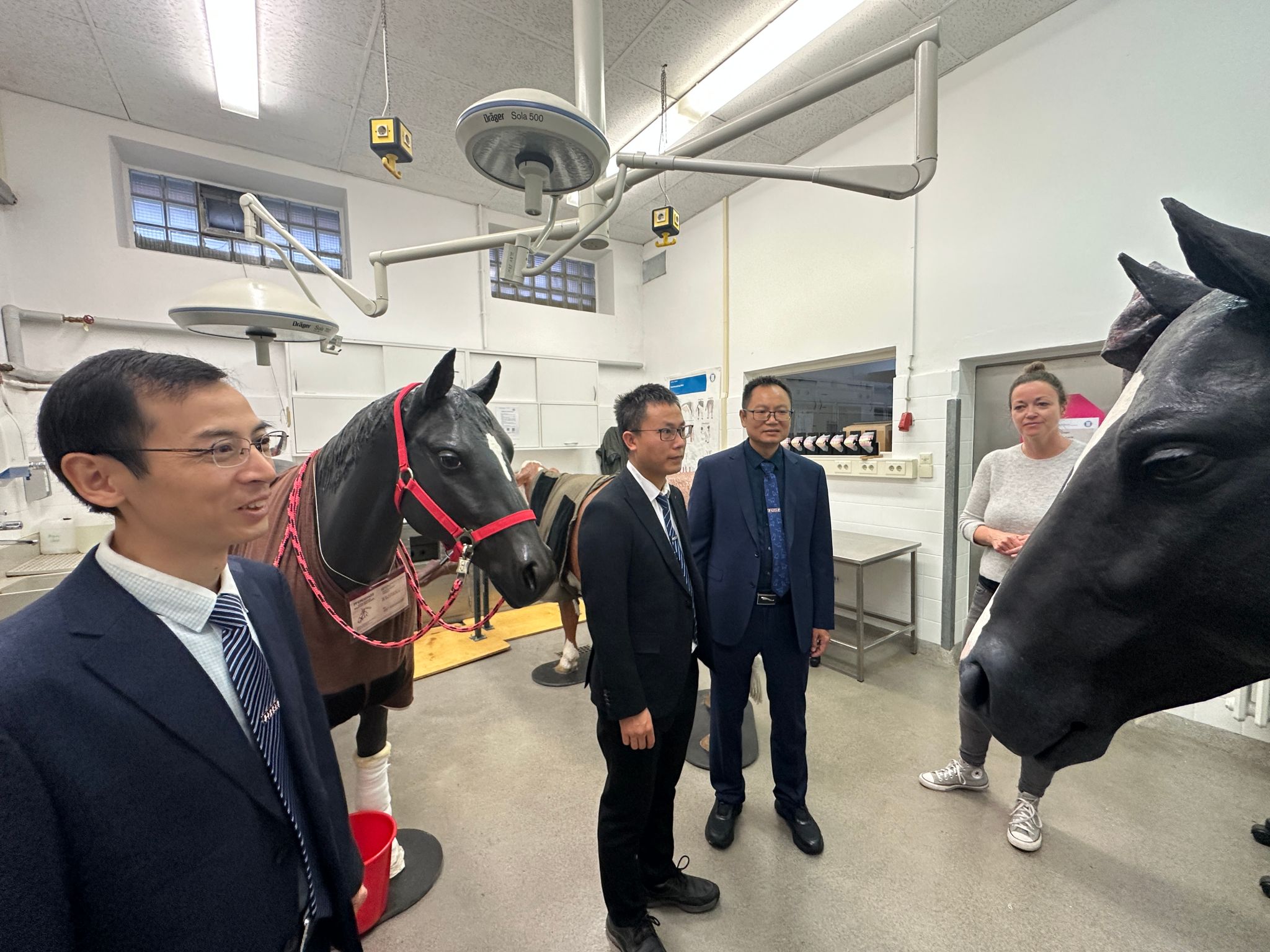 在柏林自由大学兽医学院,代表团与院长Uwe Rösler及学院相关人员进行座谈。Rösler院长分享了该院与泰国、印度尼西亚等国合作培养职业兽医的成功经验。刘兴斌表示,两院在科技创新与社会服务领域的理念和定位高度契合,期望双方找准合作切入点,共同践行“同一个健康”理念。他提出,希望借鉴对方经验,在构建高水平兽医人才培养体系方面深化合作,并围绕疫病防控等优势科研领域强强联合,推动科研水平迈向新高度,同时欢迎对方师生来校交流。代表团还详细参观了学院的多个研究所、马兽医教室和图书馆等教学科研设施。