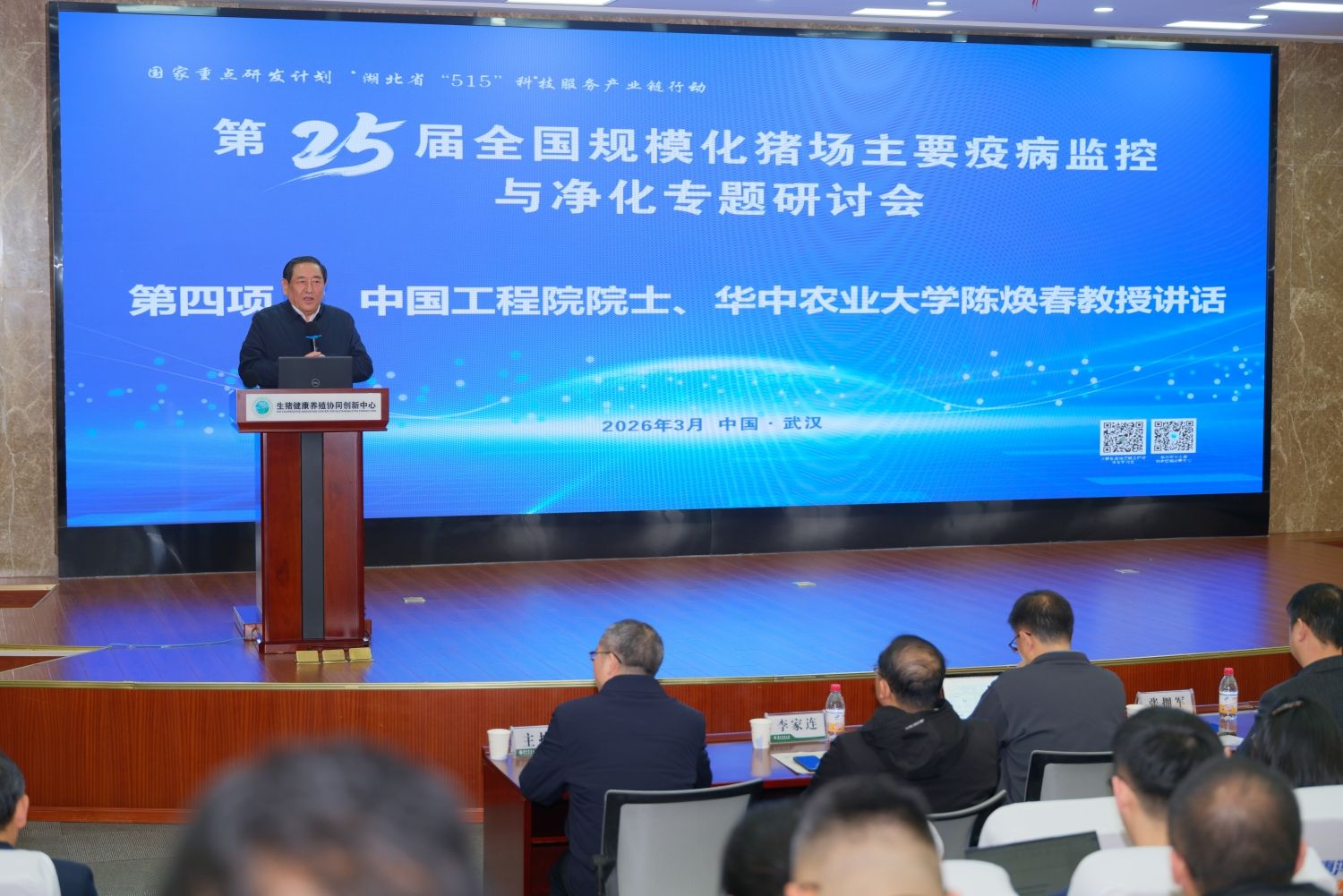 陈焕春在讲话中结合当前生猪疫病防控新形势,强调了科技赋能疫病防控的重要性。他指出,当前猪病毒株变异与重组态势仍在加剧,防控工作需紧跟行业发展需求,进一步强化疫病流行病学与病原学研究,精准对接猪场实际防控需求,研发更具针对性的防控产品与技术方案,同时推动实验室诊断与临床兽医服务体系深度融合,为生猪产业高质量发展筑牢生物安全防线。