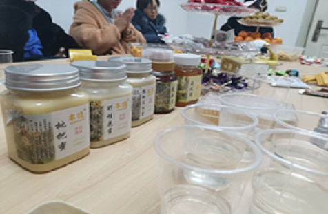 活动通过以茶话会的形式,活动现场准备了新鲜果盘、零食甜点,各种不同类型的蜂蜜水,以轻松愉快的方式针对单花蜜的特色,生产过程,以及如何鉴别真假蜂蜜等大家感兴趣的话题进行了愉快的交流和探讨。同学们分享五种单花蜜:野桂花蜜、鸭脚木蜜、枇杷蜜、荔枝蜜、龙眼蜜等冲泡蜂蜜水的口感,并对各自的特点和功效做简单介绍。野桂花蜜清香,鸭脚木蜜发汗,枇杷蜜润肺止咳,龙眼蜜补气养颜,荔枝蜜芳香生津。