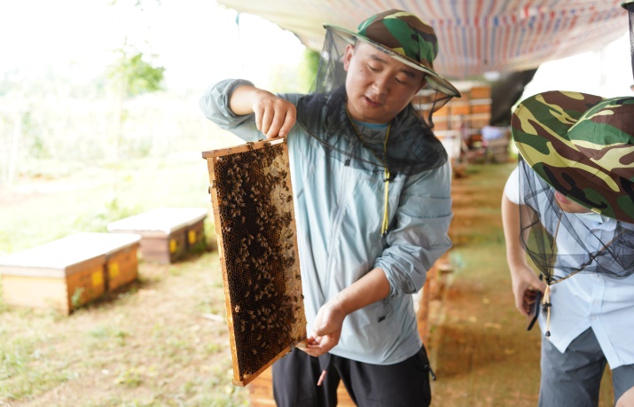 “燃香主要是防止蜜蜂进攻,它们怕浓烟。一会开蜂箱的时候保持安静就好。”负责蜂场知识讲解的王振说道。香燃起来了,一只、两只……一群蜜蜂飞出蜂箱,烟雾中蜜蜂好像沾染了禅意,在王振娴熟的操作下,它们安静地分散在四周。