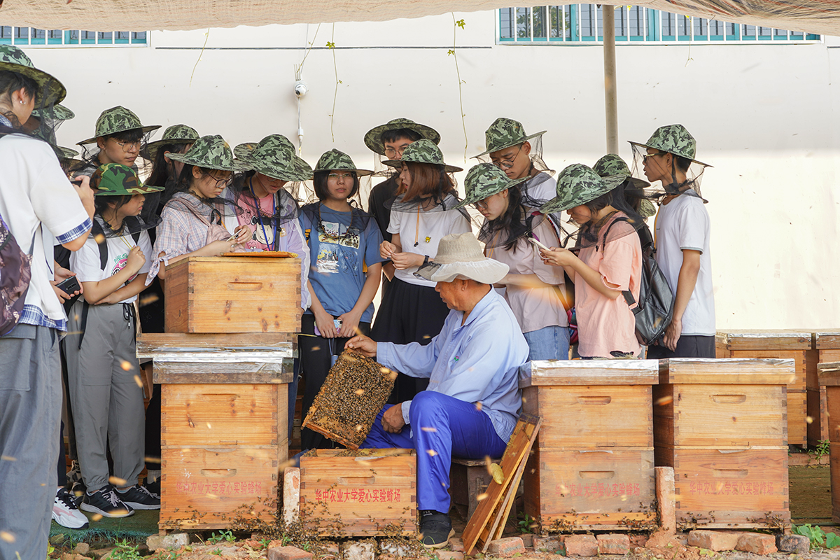 副教授李翔带领同学们一起探索蜜蜂世界的秘密。不足两米宽的走道两旁整整齐齐码着两列蜂箱,马蜂与蜜蜂在空中飞舞,偶尔停靠在同学们佩戴的迷彩蜂帽上,师生在互动中感受自然气息。