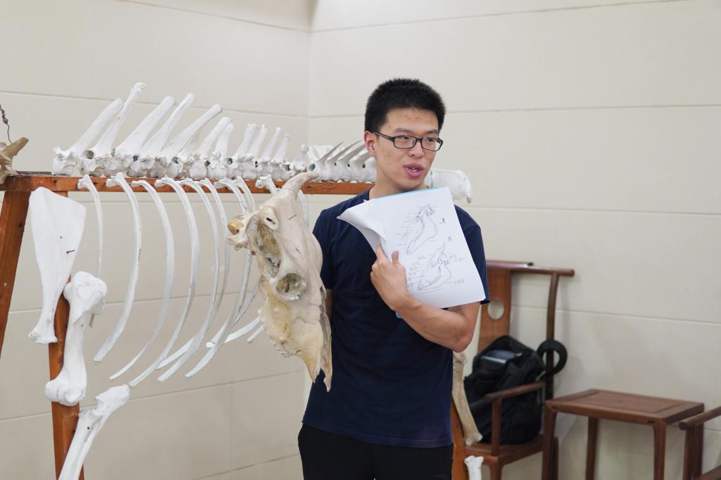 “大家知道牛的椎骨分为几部分吗?”10月2日下午,动科楼一楼中庭内传来阵阵欢笑声。动科1901班的杜瑾鸿结合牛骨骼标本,将牛的骨骼按照头骨、躯干骨、四肢骨的顺序依次进行了详细讲解,现场同学们认真仔细学习牛骨知识,在随后的牛骨拼装体验中“玩”得不亦乐乎。