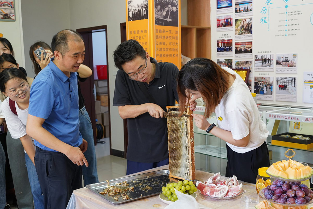 参观蜂蜜繁育基地之后,李翔向同学们介绍基地情况和蜂蜜产业知识,并带领同学们体验取蜜的全过程。“取蜜,需要经过取蜂脾、切蜂蜡、摇蜜、过滤、分装五个步骤。”同学们一字排开,耐心地聆听李翔讲解取蜜的动作要领。校党委宣传部常务副部长吴义生、离退休工作部部长鲁满新等老师参与到取蜜队伍中,与同学们一同完成取蜜与制作蜂蜜产品的任务。