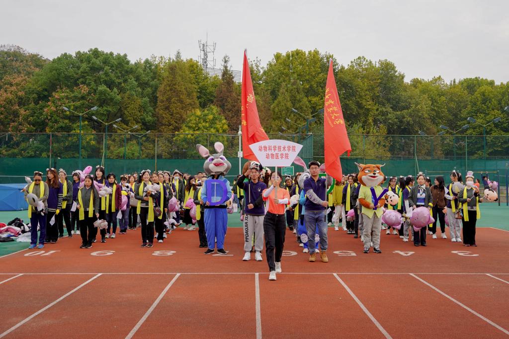 代表方阵身着动物玩偶服、动物发箍,手持动物气球、“DKDY”字母牌,高喊“发扬体育精神,增强师生体质,动科动医,勇创第一”的口号,快步走过观礼台。