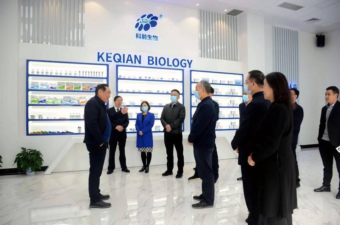 ▲陈焕春院士向农业农村部副部长马有祥一行介绍科前股份有限公司情况(匡敏 摄)