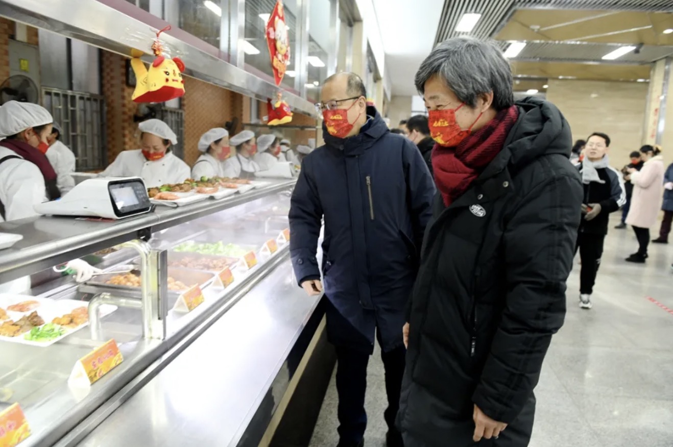 ▲华中农大党委书记高翅、校长李召虎察看学生食堂菜品(吴晗 摄)