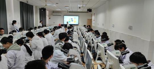 《操作技术》首次开课,范盛先老师对两百余名选课学生进行课程介绍和实验室安全教育,同学们完成线上实验室安全教育测试,并签订《实验室安全告知书》。在实验教学环节,刘晓丽老师借助雨课堂发布的“预习测试题”进行现场考核,并针对学生错误率高的内容进行重点讲解与总结点评,颠覆“老师讲、学生听”的传统实验教学模式。进入实操环节,同学们根据预习视频中的讲解练习显微镜的使用,由4名教师组成的教学团队在现场做一对一指导、答疑,手把手规范操作技术。最后,同学们还需要通过显微镜使用实操考核、提交图像处理作业。