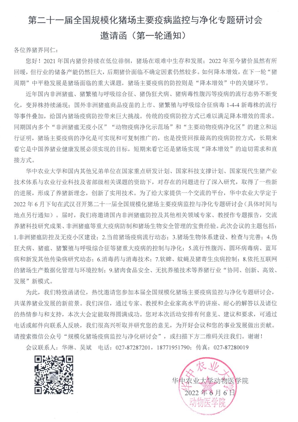 第二十一届全国规模化猪场主要疫病监控与净化专题研讨会邀请函