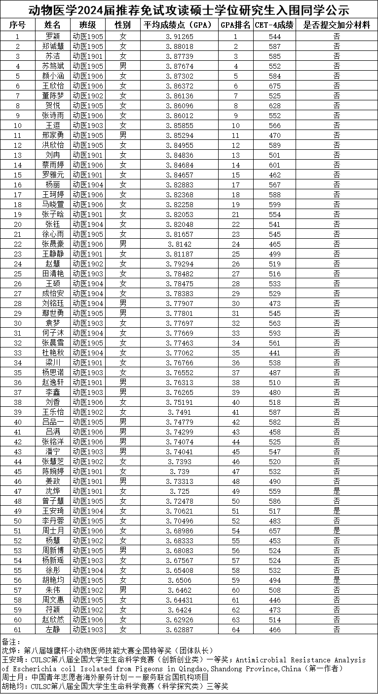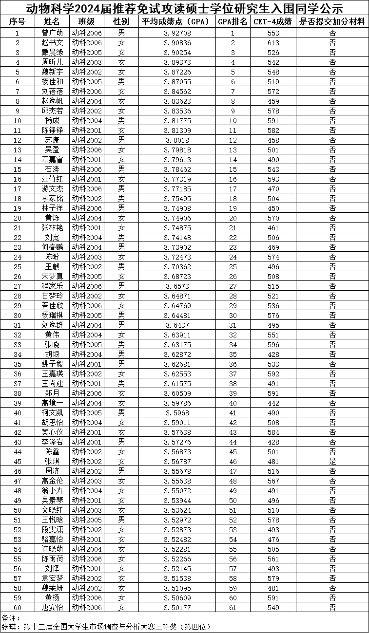 根据《华中农业大学动物科学技术学院、动物医学院2024年推荐优秀应届本科毕业生免试攻读硕士学位研究生遴选方案》,经个人申请、资格审核,咨询评审小组意见,现将2024届推荐免试攻读研究生入围名单进行公示。下一步将进行专家遴选小组审核鉴定。