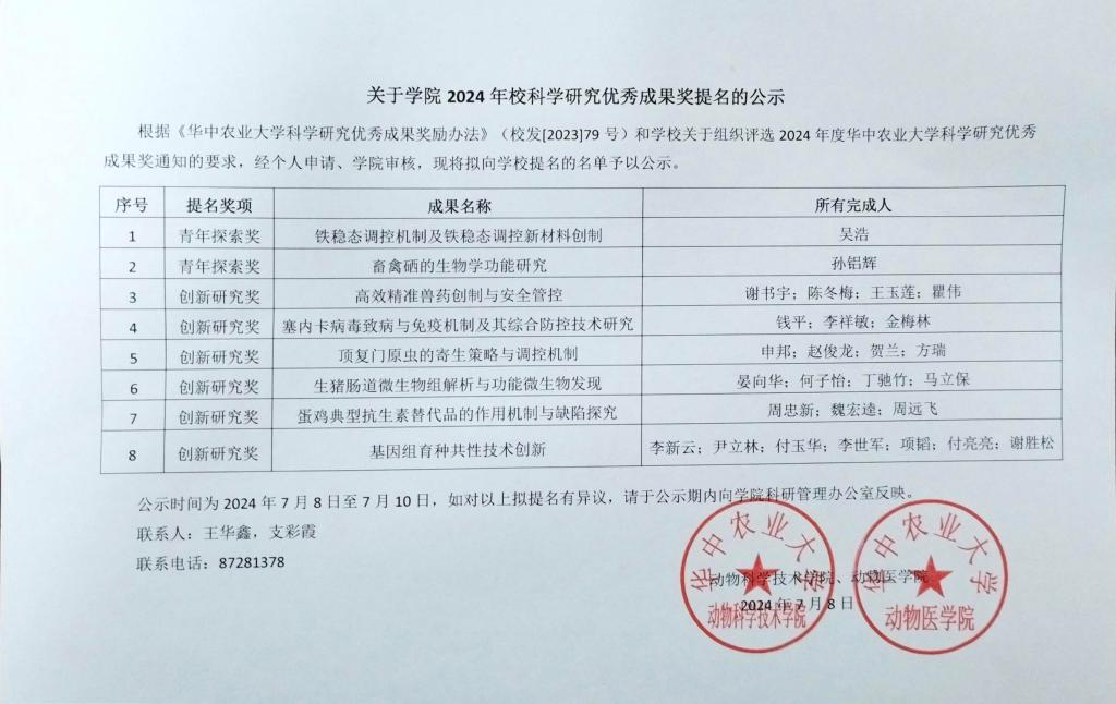 关于学院2024年校科学研究优秀成果奖提名的公示