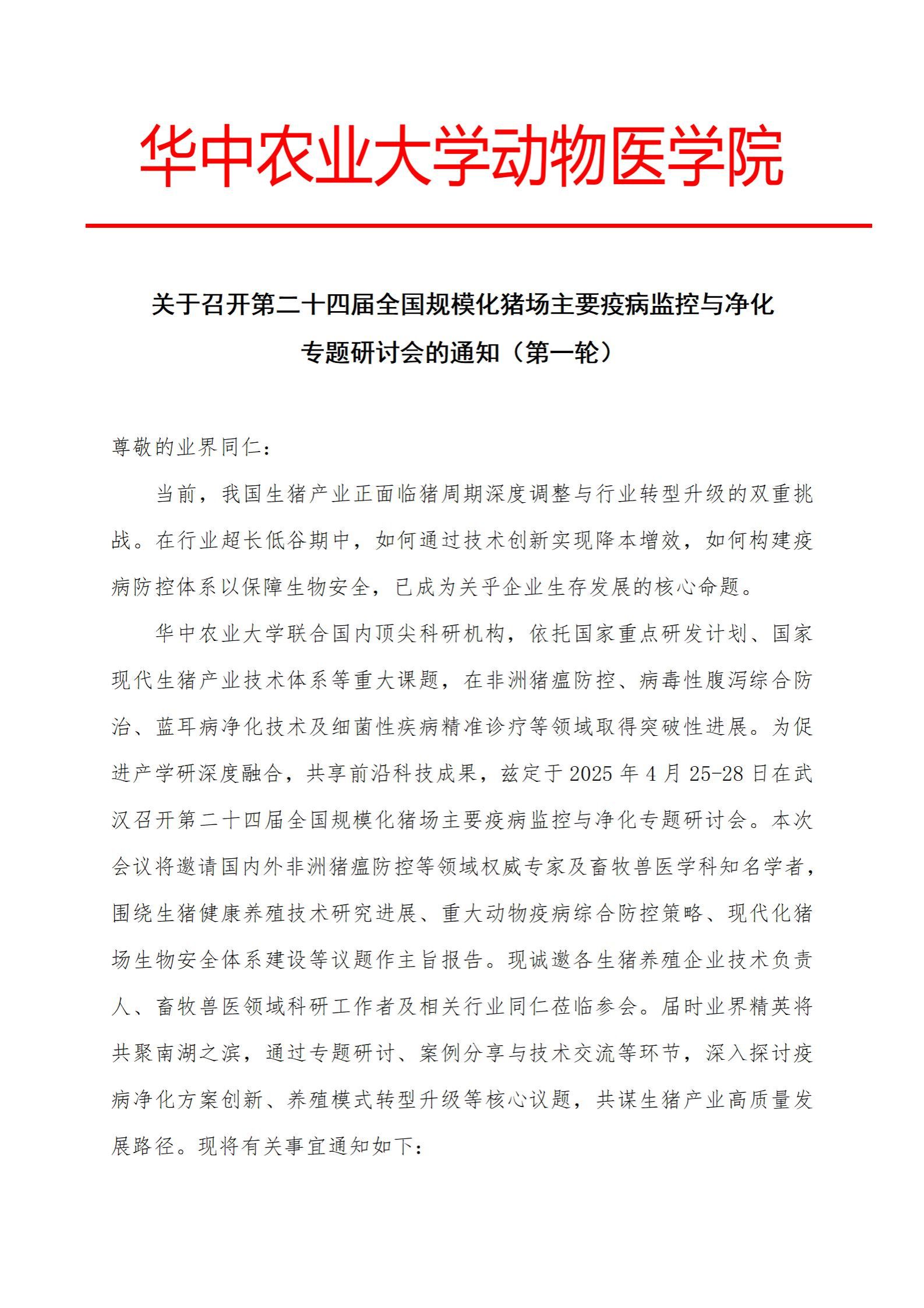 关于召开第二十四届全国规模化猪场主要疫病监控与净化专题研讨会的通知(第一轮)