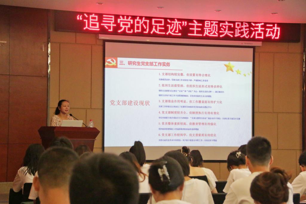 付兆佳指出,提升高校基层党支部组织力是党的十九大报告中明确提出的新时代党的建设总要求,是全面加强高校党的政治建设的迫切要求,是切实担负立德树人根本任务的迫切要求,也是切实担负立德树人根本任务的迫切要求。研究生党支部作为高校基层党组织的重要组成部分,是引领研究生刻苦学习、团结进步、健康成长的重要阵地。 保障党员发展质量是开展党支部工作的首要之义。在工作过程中,各党支部支委一定要明确研究生党支部工作的基本任务,推进标准化规范化建设。付兆佳着重讲解了研究生党支部的工作实务部分,她指出,高校研究生党支部发展模式在应对新形势下的挑战时显现出一些问题和不足之处。在培训中,付兆佳根据她丰富的工作经验,细心、耐心地与实践团共同探讨研究生党支部党建工作开展过程中的具体要求、困难之处和改进措施。参会的党支部书记、支部委员等人均表示在此次主题实践活动中收获颇丰。