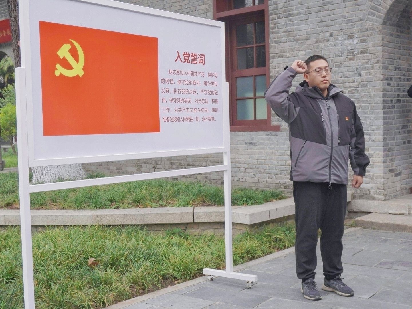 在中共五大会址纪念馆的党旗下,五楼自拍