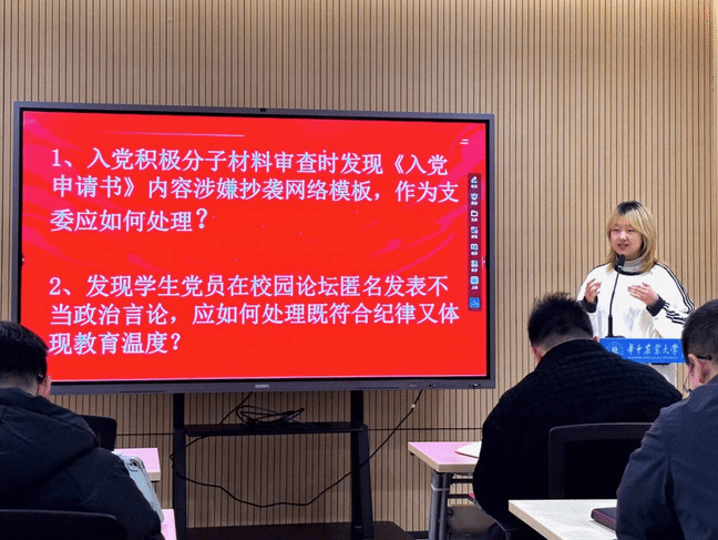 程唐煜指出,此次活动对学院后续党支部建设意义重大。他介绍,活动第一部分为各支部相互学习交流,目的在于促使党员同志们充分发挥党支部优势以及党员的先锋模范作用;第二部分是党务工作实操培训,重点聚焦入党积极分子到正式党员发展进程中存在的问题,深入探讨如何平衡教育温度与党员管理要求;第三部分为创新风采展示,主要思考怎么融合党员个体优势、党支部组织力量以及学院特色优势,充分发挥发挥学科与专业特色。提及五楼自拍