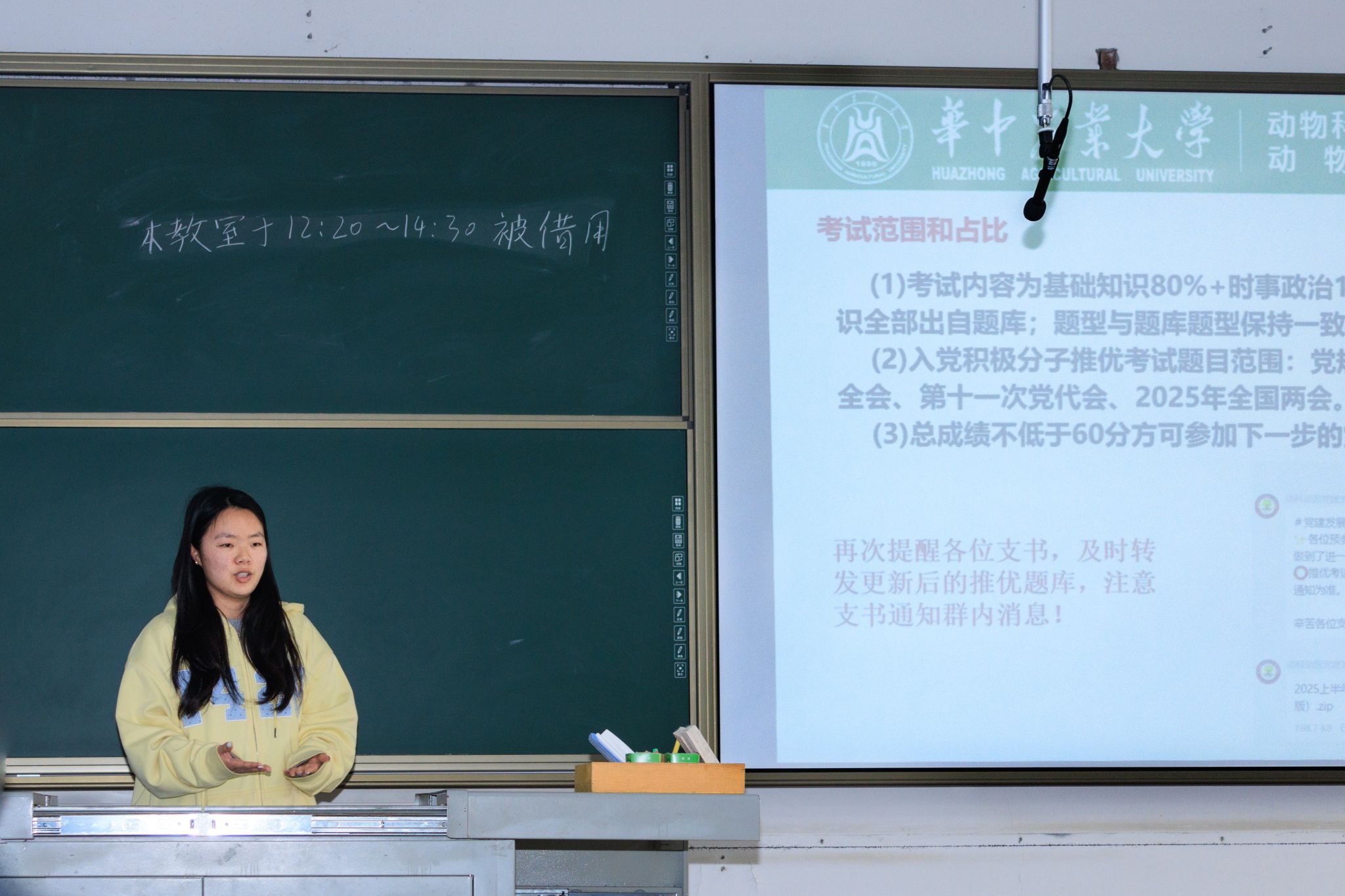 李瑞提醒参会人员,本学期党支部推优不限制名额。同时,她向在座同学介绍了入党积极分子推优资格考试的范围和占比:考试内容为基础知识80%+时事政治15%+基础拓展5%,其中基础知识全部出自题库,题型与题库题型保持一致。