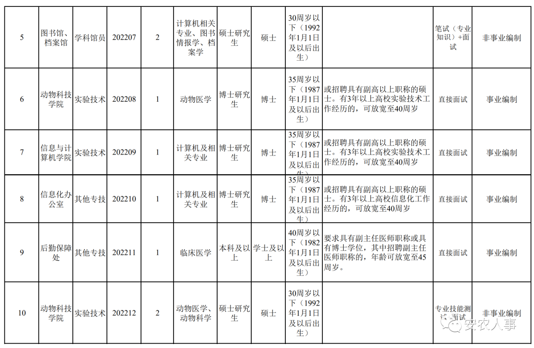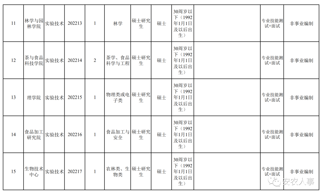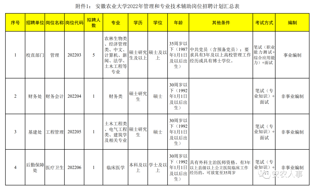 管理人员和专业技术辅助人员队伍建设,切实做好学校面向社会公开招聘工作,根据《事业单位人事管理条例》(国务院令第652号)、中共安徽省委组织部、安徽省人力资源社会保障厅《关于印发〈安徽省事业单位公开招聘人员暂行办法〉的通知》(皖人社发〔2010〕78号),现将2022年度学校管理和专业技术辅助岗位公开招聘有关事项公告如下: