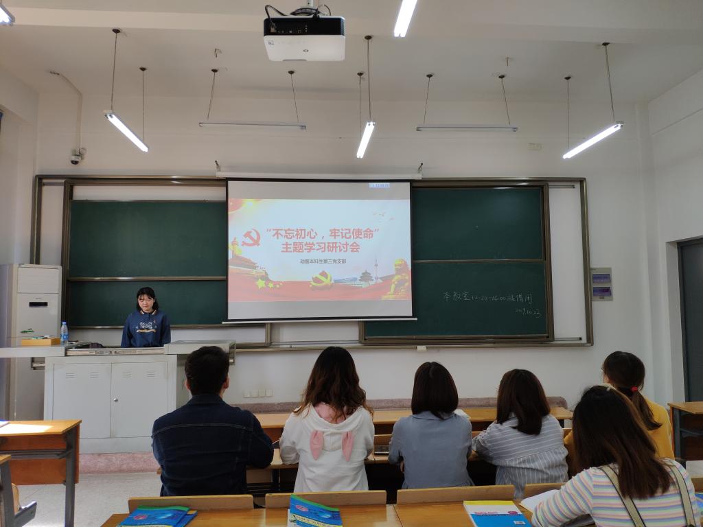内容提要:2019年10月23日(星期三)中午12点20分,动医本科生第三党支部在第四教学楼c110开展了“不忘初心,牢记使命”主题研讨会,动医本科生第三党支部成员出席了本次会议。