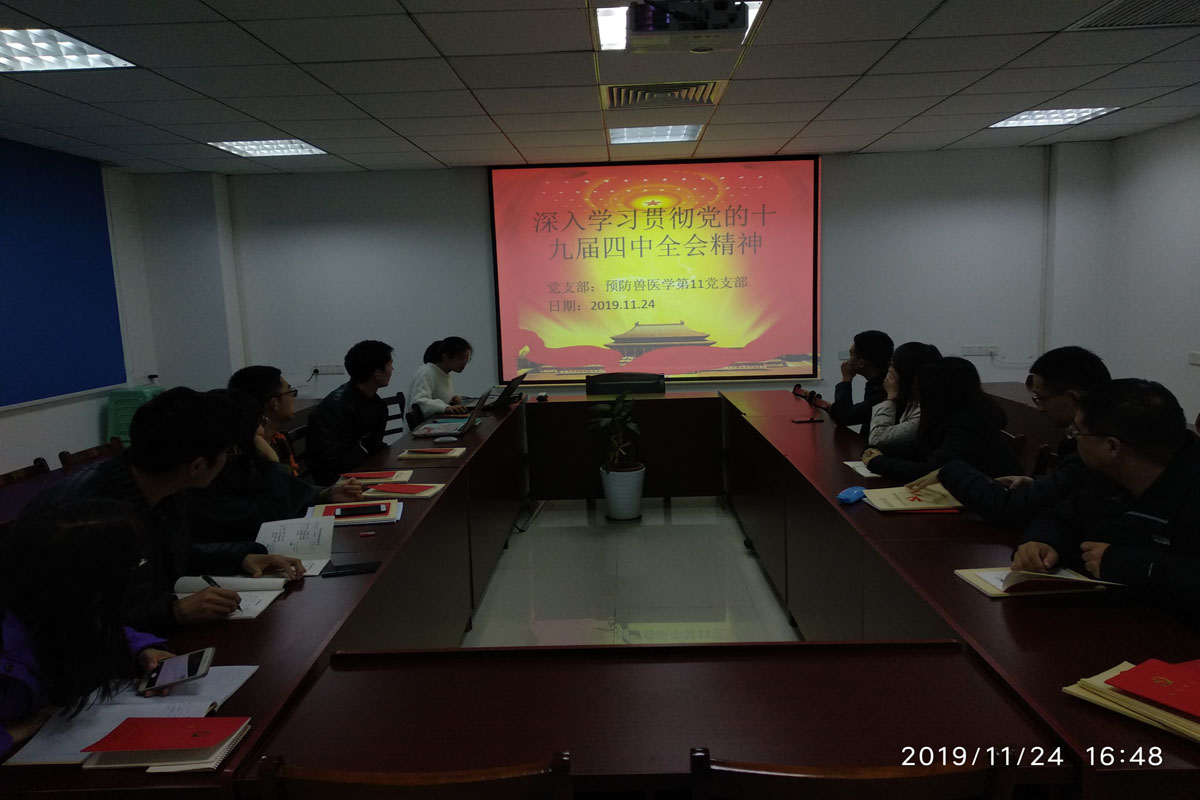 预防兽医学研究生第十一支部于生猪健康养殖协同创新中心214会议室召开“深入学习贯彻党的十九届四中全会精神”全体党员大会,出席本次活动的有支部全体党员同志及部分入党积极分子。