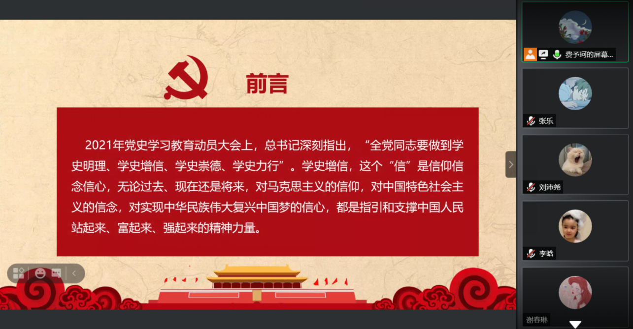 动物营养与饲料科学研究生第一支部联合第十二支部在腾讯会议上召开了“学史增信”专题研讨活动。党支部全体党员参加本次会议,会议由党支部书记费予珂、李亚梅同志共同主持。