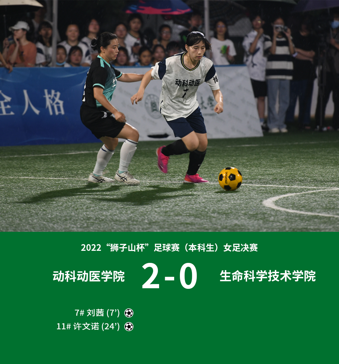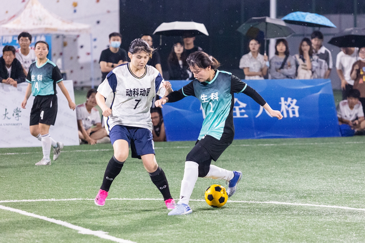 女足在雨中2:0战胜生命科学技术学院女足,获得冠军,生命科学技术学院女足获得亚军。