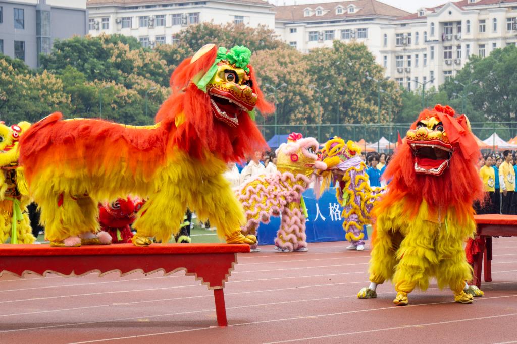 鼓声强劲有力,八只醒狮威风凛凛、活灵活现,精彩的表演赢得了在场观众热烈的掌声。运动会开幕式在全场观众的欢呼声中拉开了序幕。紧接着,由14个学院一千六百八十名广播操队员带来的第九套广播体操表演开始了。秋雨如绵,五楼自拍