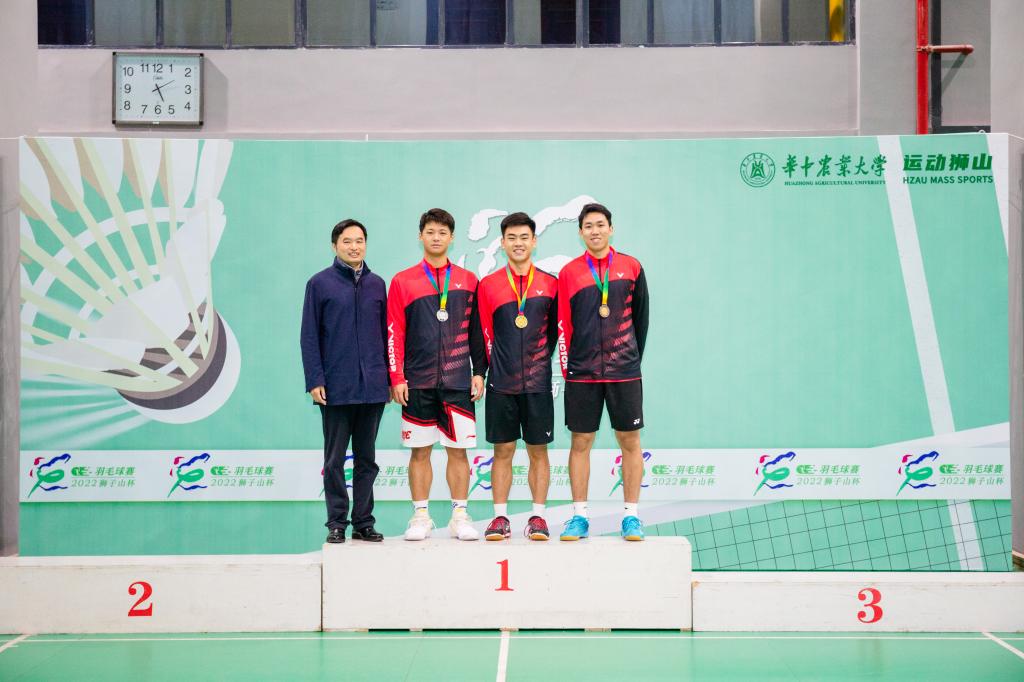 校党委副书记王从严为乙组男单冠亚季军颁奖后合影(侯国涛 摄)