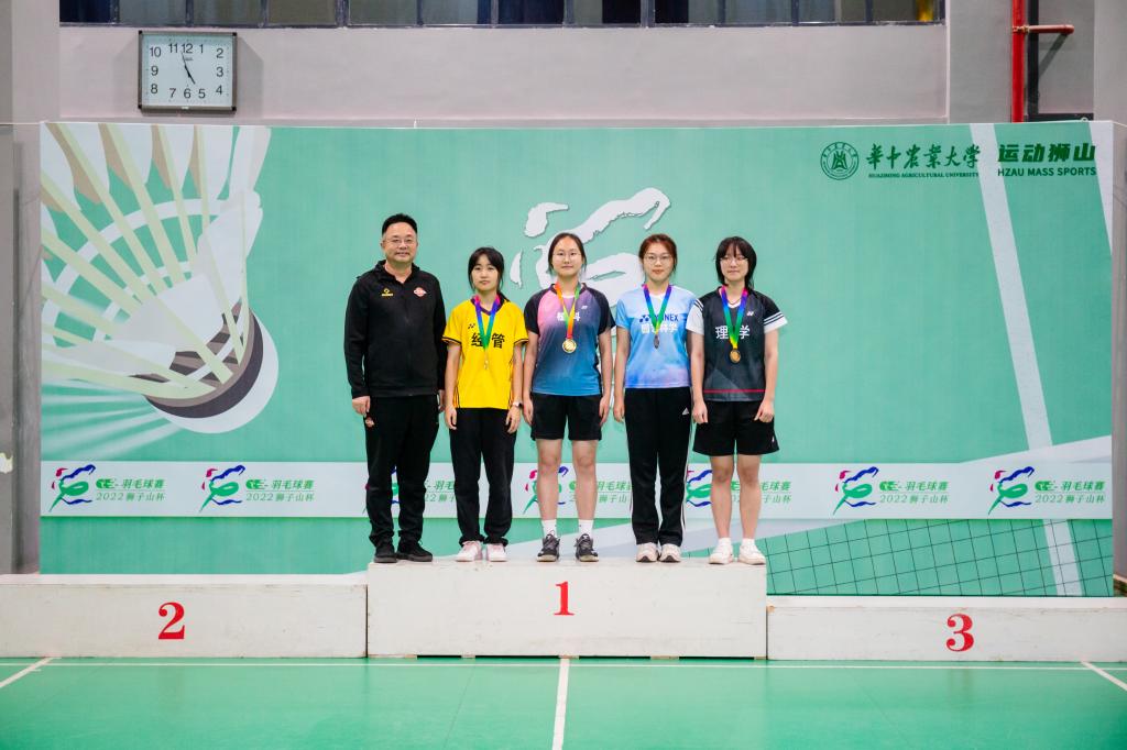 校党委常委、副校长青平为甲组女单冠亚季军颁奖后合影(侯国涛 摄)