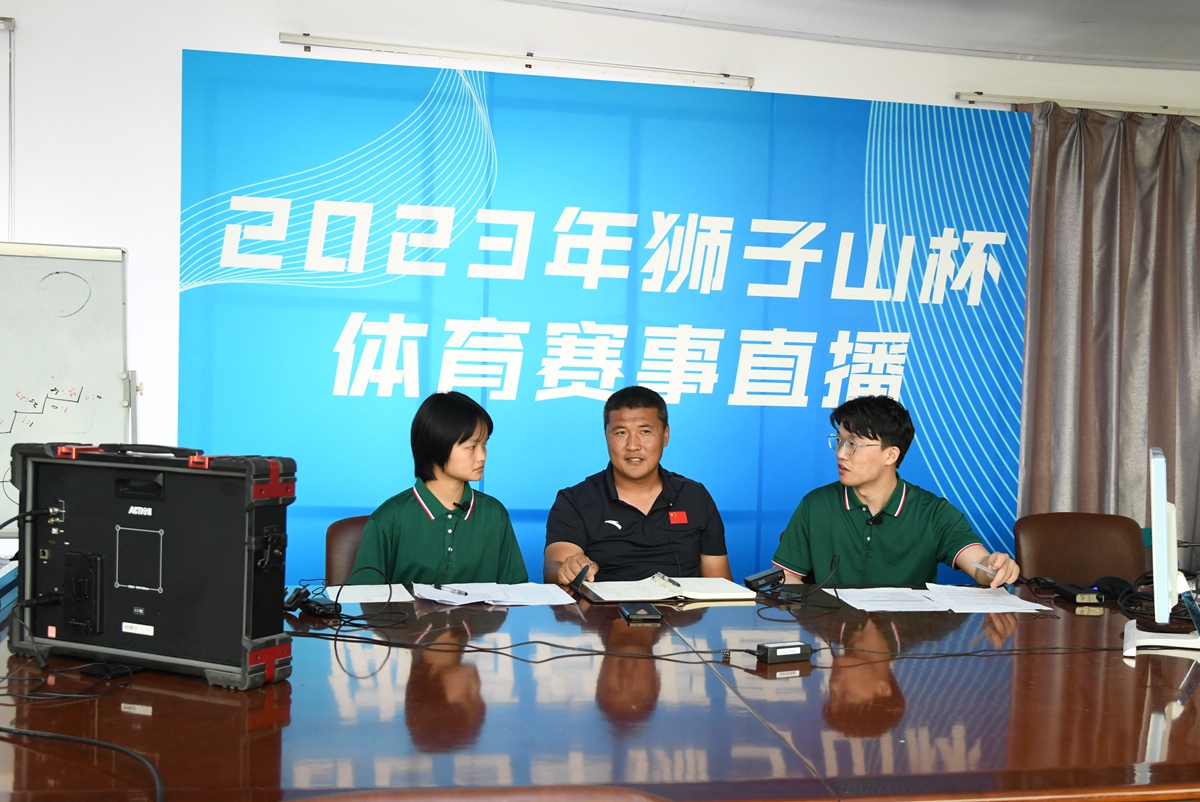 闫彬老师和蒋燕矫同学(左一)、工学院李成皓同学正在作直播解说(记者 徐行 摄)