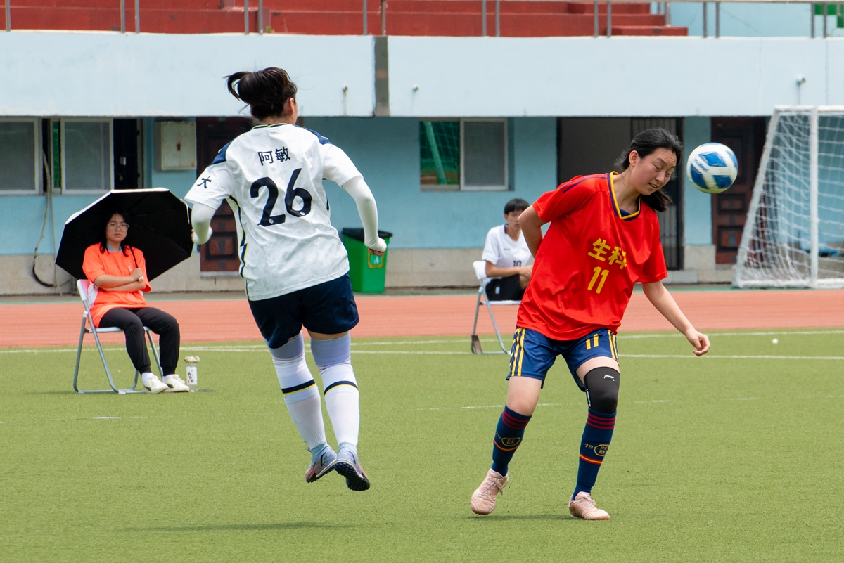 生科学院11号孔繁岩头球解围(学通社记者 高言曦 摄)