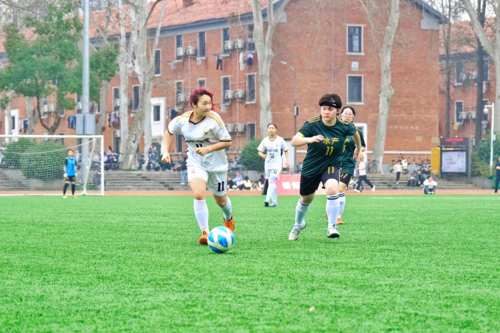 队迅速发起攻势,积极向前推进传球,突破水产学院队防线,比赛第五分钟,11号许文诺射门拿下首分。随后五楼自拍