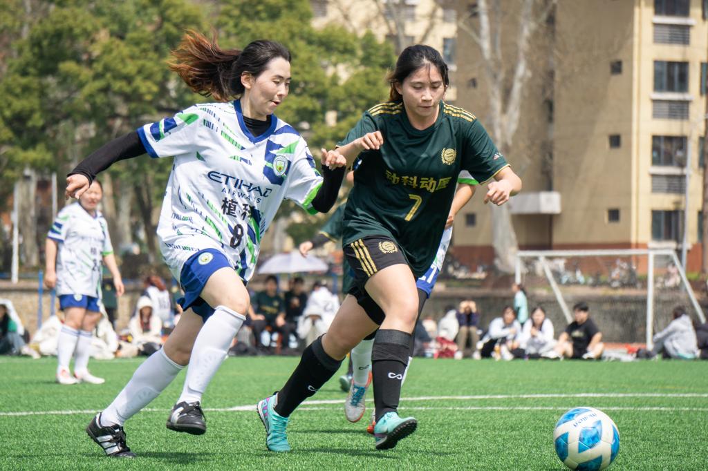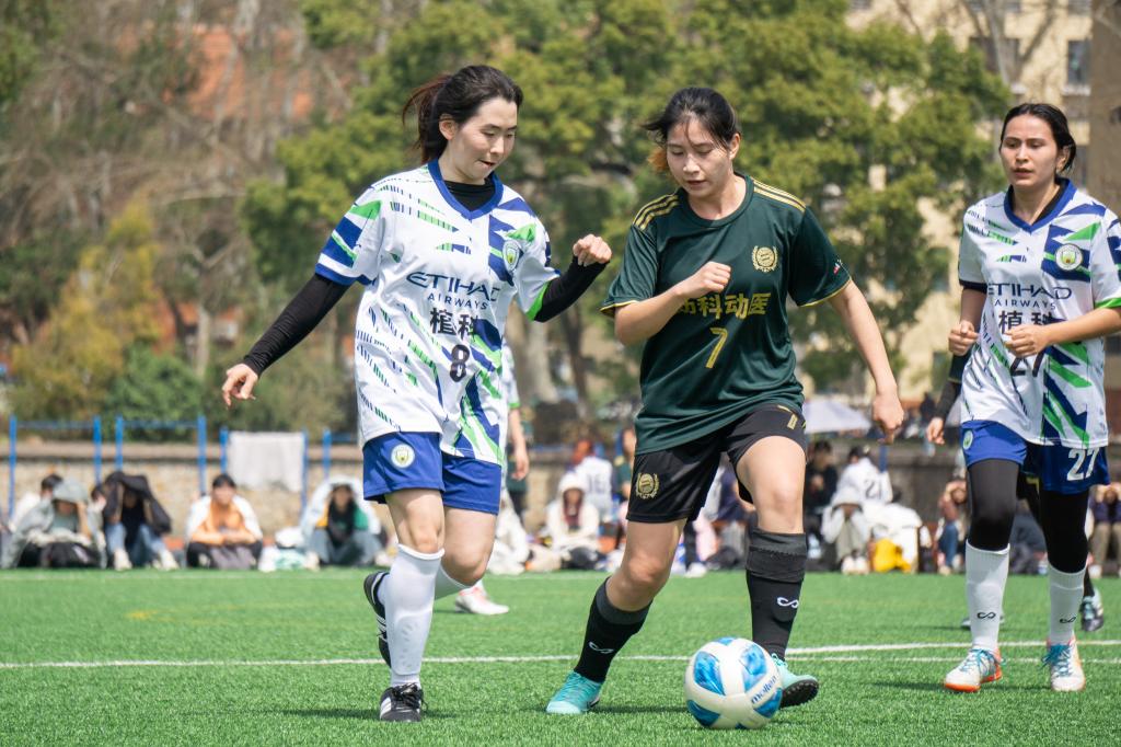 7号刘茜趁对方未及时回位掷出界外球,22号车文萱把握住机会,右脚横射,踢进全场比赛第一球,赢得全场欢呼。