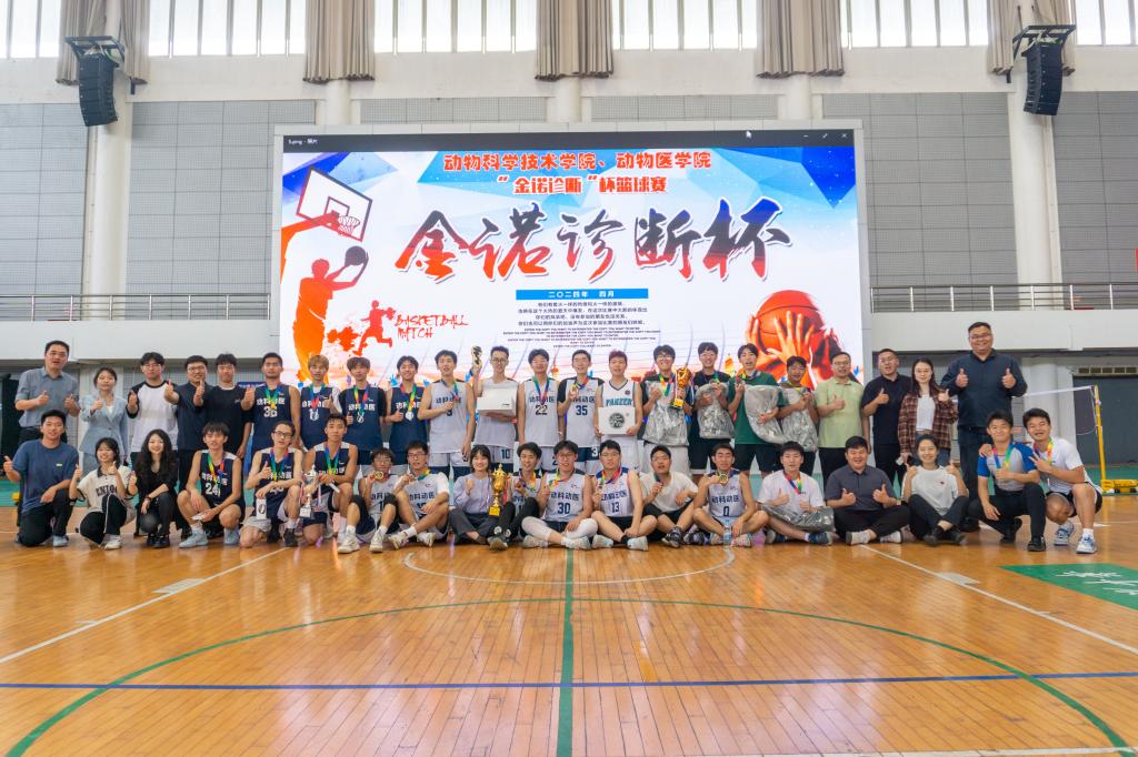 颁奖环节,北京金诺百泰公司代表、学院党委副书记、学院团委书记出席并为获奖队伍颁发奖项。学院党委副书记杨冬凯老师、北京金诺诊断市场总监金卉女士为冠军队伍——“毕业生联队”颁奖,北京金诺诊断销售总监方磊先生为亚军队伍——“王修远方传来风笛队”颁奖,学院团委书记谭力铭老师为季军队伍——“陶喆的队”颁奖。颁奖仪式结束后,全体参赛球员合影留念,至此,本届“牧医杯”篮球赛圆满落下帷幕。
