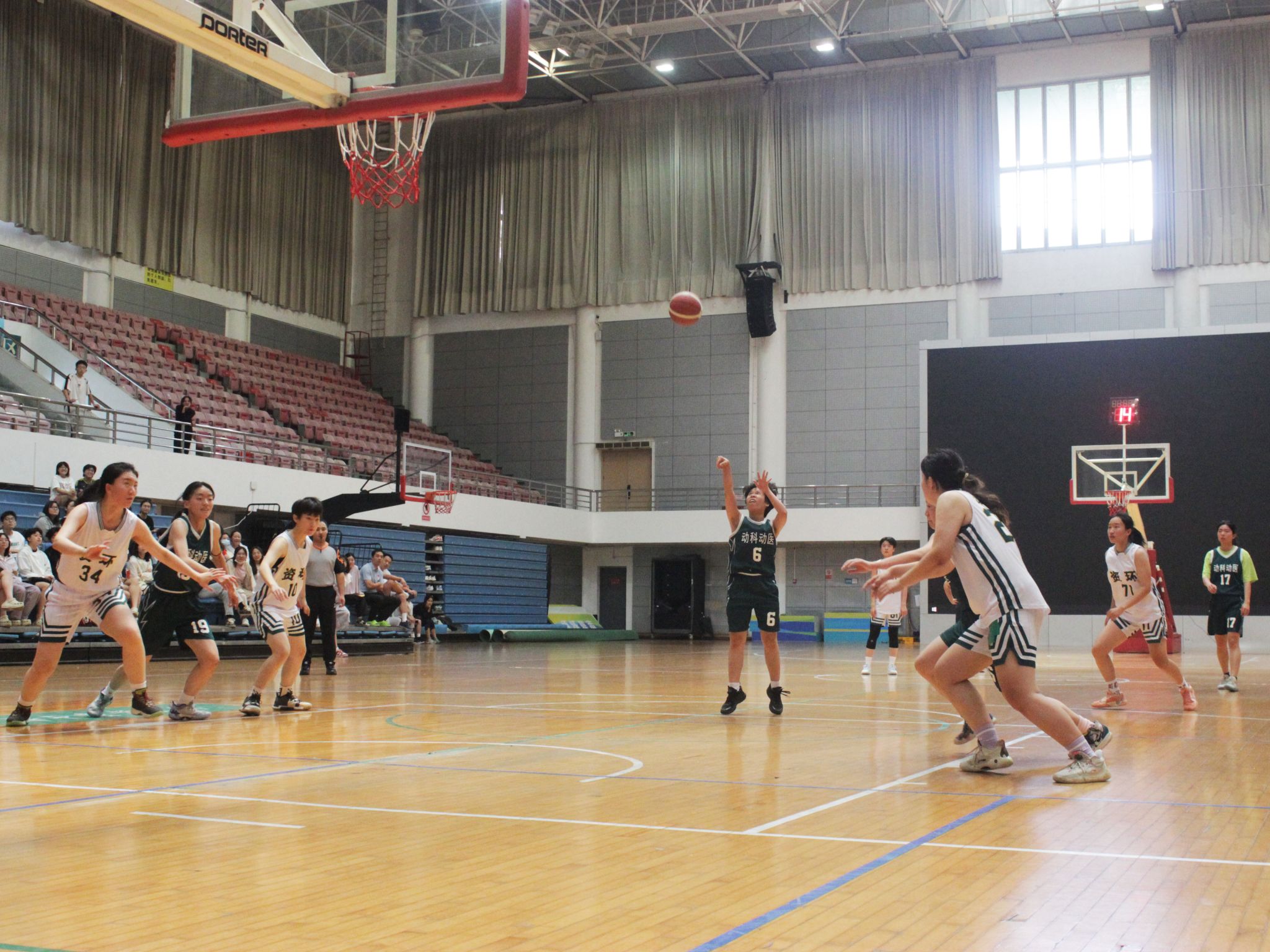 女篮17号徐金叶果断跳球,为球队赢得球权。6号黄露婷也展现出积极态度,完成精彩边线救球。比赛初期,球队暂时以0 : 4落后,但队员们迅速调整状态,66号杨依晨先是果断上篮,拿下球队本场首个2分,又以一记投射再添2分。进入第二节,11号武文英持球突破拿下2分,6号黄露婷再度抢断快攻得手。19号李应雅更是在24秒进攻时间即将结束时,投出一记精彩三分球。球队运用“1211”全场联防战术,多次成功抢断,逐渐将比分追到14:13领先。