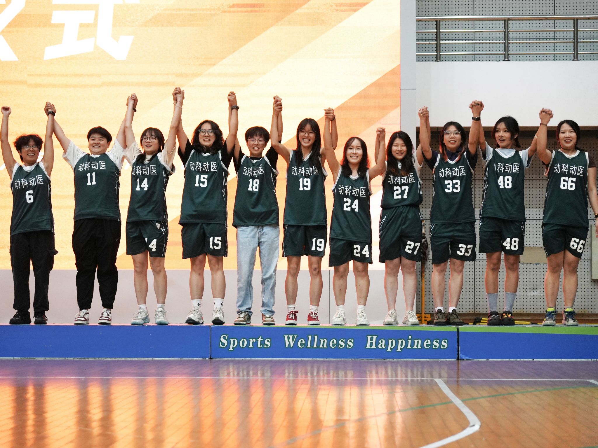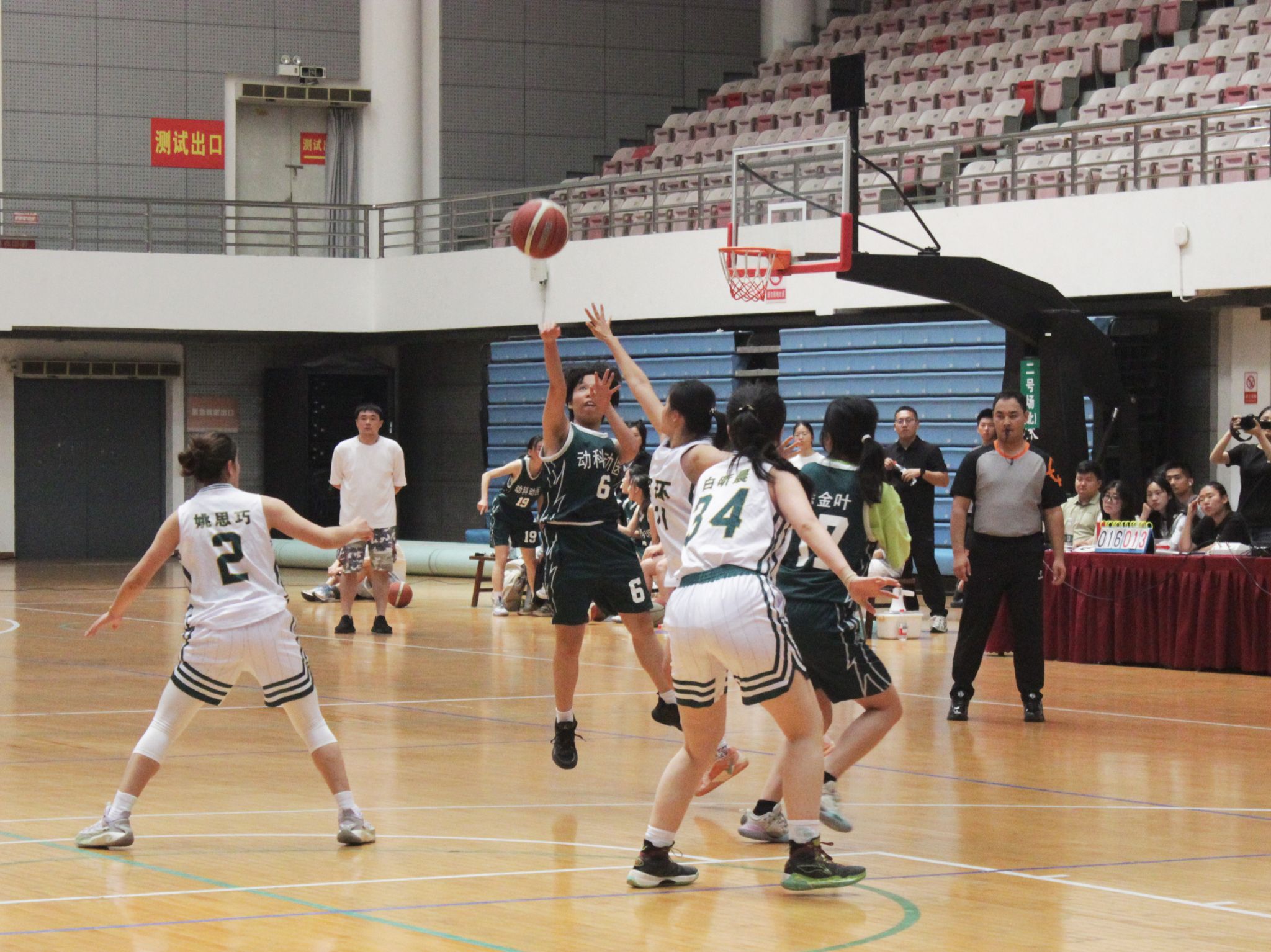 下半场比赛进入白热化阶段,双方分数紧咬。11号武文英率先在外线创造空位机会,精准命中一记三分球。在对面连续上篮和罚球得分后,17号徐金叶凭借出色防守和预判意识成功盖帽,又在罚球线上顶住压力,两罚全中,为球队巩固优势。19号李应雅篮下抢板后快攻反击拿下2分,66号杨依晨再度远投3分命中,6号黄露婷更是抢断快攻完成“2 + 1”,拿下3分,打出精彩进攻。